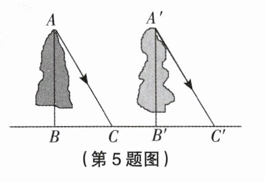 5. 如图,太阳光线AC与A'C'是平行的,AB表示一棵塔松,A'B'表示一棵杨树,同一时刻两棵树的影长相等. 若杨树高5 m,则塔松的高为_______.