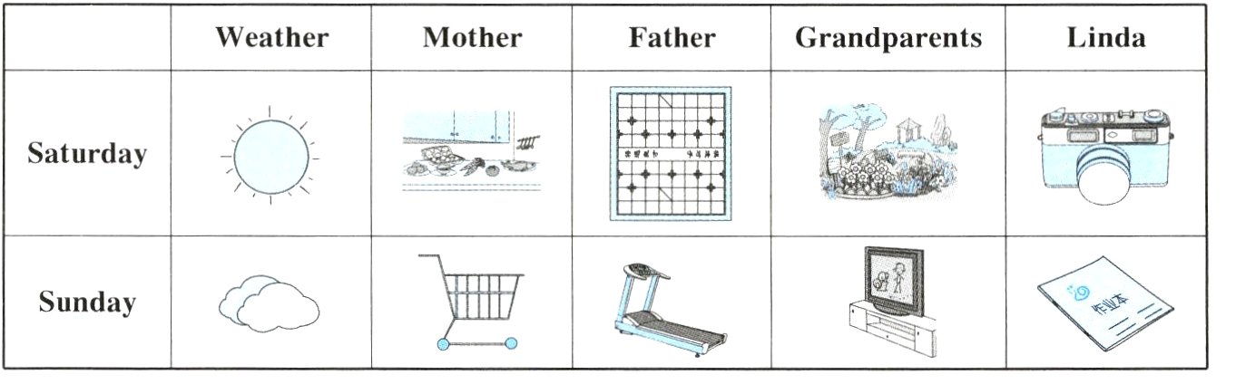 It was Sunday. It was cloudy. My mother went shopping with her friends. My father had sports in the morning. My grandparents watched TV at home. I did my homework in the afternoon.