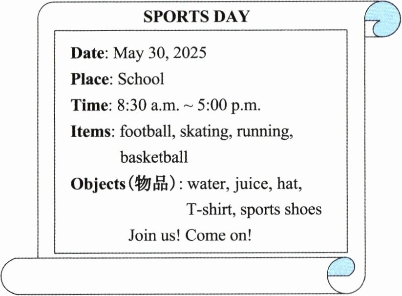 Objects(物品): water, juice, hat, T - shirt, sports shoes