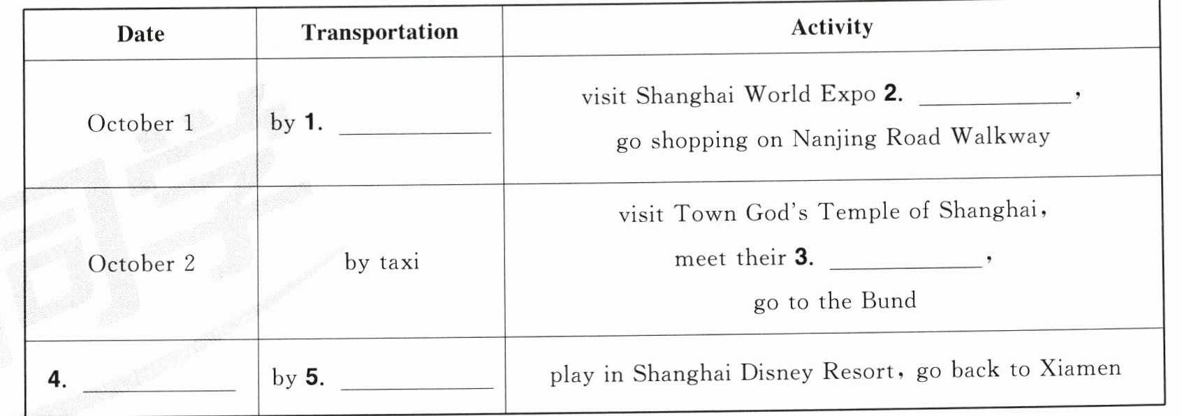 National Day is coming. The Smiths are going to take a trip to Shanghai. On October 1, they will fly to Shanghai from Xiamen. They are going to visit Shanghai World Expo Museum(上海世博会博物馆). They are going to go shopping on Nanjing Road Walkway(南京路步行街)in the evening. On October 2, they are going to visit Town God’s Temple of Shanghai(上海城隍庙)by taxi. In the afternoon, they are going to meet their friends. They are going to the Bund(外滩) in the evening. On the third day of the trip, they will play in Shanghai Disney Resort, and then they will go back to Xiamen by train. They will have much fun during the trip.