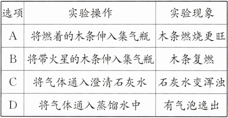 C [解析]将燃着的木条伸入集气瓶,木条燃烧更旺,不可能是二氧化碳,因为二氧化碳不能燃烧、不能支持燃烧,A错误;将带火星的木条伸入集气瓶,木条复燃,说明瓶内气体能支持燃烧,不可能是二氧化碳,B错误;二氧化碳能使澄清石灰水变浑浊,将气体通入澄清石灰水,石灰水变浑浊,说明该无色无味气体是二氧化碳,C正确;将气体通入蒸馏水中,有气泡逸出,不一定是二氧化碳,也可能是氢气、氧气等气体,D错误。