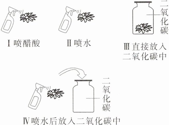 3. 为探究二氧化碳能否和水反应,用四朵石蕊试液染成紫色的干燥小花完成下图四个实验。实验Ⅰ、Ⅳ中小花变红,实验Ⅱ、Ⅲ中小花不变色。下列说法不正确的是( )。