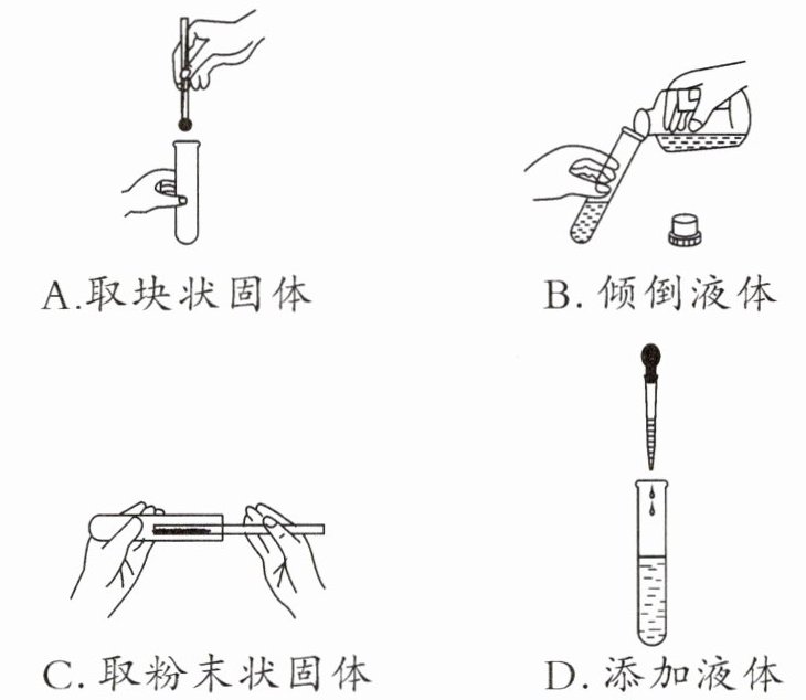 A [解析]取用块状固体试剂时,应将试管横放,用镊子把试剂送到试管口,再把试管慢慢竖起,A错误;向试管中倾倒液体试剂时,瓶塞要倒放,标签要对准手心,瓶口紧挨试管口,B正确;取用粉末状固体试剂时可用药匙或纸槽把试剂送到试管底部,然后将试管竖直起来,防止药品粘在管壁上,C正确;用滴管滴加液体时,滴管不应伸入试管内或接触试管壁,应垂直悬空于管口正上方滴加,D正确。