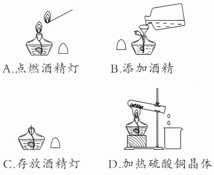 C [解析]酒精具有可燃性,点燃时要用火柴点燃,不能用燃着的酒精灯去点燃另一个酒精灯,A正确;要用漏斗添加酒精,不能直接添加,更不能向燃着的酒精灯中直接添加酒精,B正确;酒精灯不用时要盖上灯帽,可防止酒精挥发,将水分残留在灯芯上,下次不易点燃,C错误;在加热固体时,要用酒精灯的外焰加热,试管口略向下倾斜,D正确。
