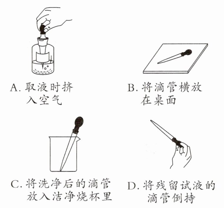 C [解析]使用胶头滴管时先挤压橡胶胶帽,再伸入溶液中吸取,A错误;胶头滴管不能倒置,也不能平放于桌面上,防止腐蚀橡胶胶帽,B错误;洗净后的滴管要放在试管架上或洁净烧杯里,C正确;将残留试液的滴管倒持会污染橡胶胶帽,D错误。