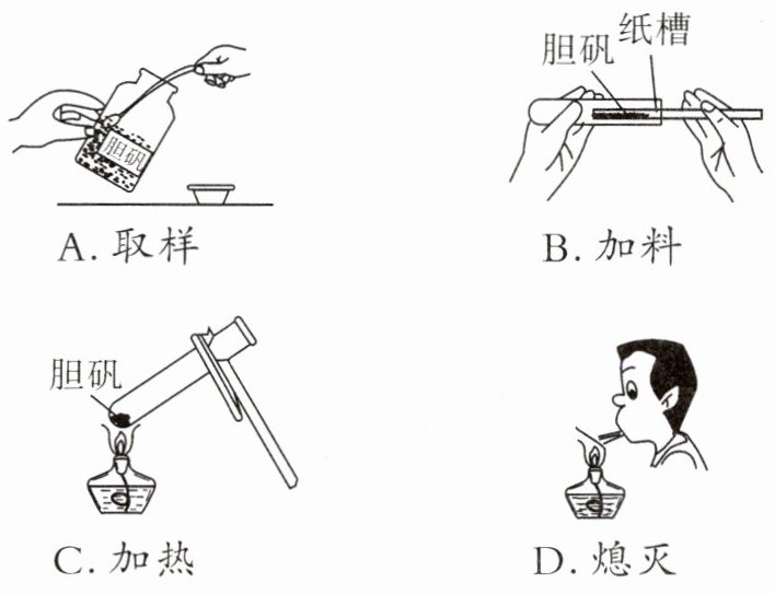 B [解析]该实验首先要取蒸馏水,取完蒸馏水要把试剂瓶放回原处,再用试管夹从试管底部向上夹到试管的中上部,点燃酒精灯,先进行预热再集中药品部位加热。