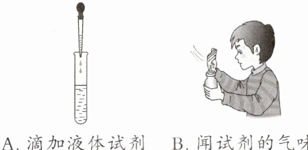 B [解析]使用胶头滴管滴加少量液体的操作,注意胶头滴管不能伸入试管内或接触试管内壁,应垂直悬空在试管口正上方滴加液体,防止污染胶头滴管,A错误;不能把鼻孔凑到容器口去闻药品的气味,B正确;取用药品时,不能用手接触药品,C错误;使用酒精灯时要注意“两查、两禁、一不可”,禁止用燃着的酒精灯引燃另一酒精灯,D错误。
