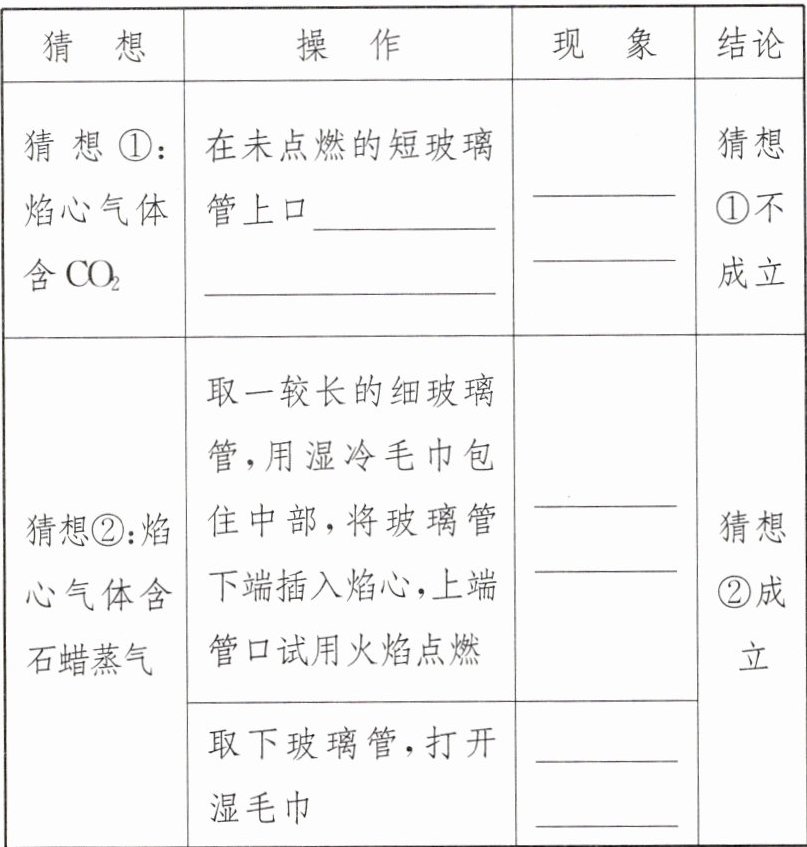 (1)硬度 蜡烛与水密度的相对大小 (2)外焰 (3)罩一个内壁涂有澄清石灰水的小烧杯 澄清石灰水没有变浑浊 上端管口没有火焰 玻璃管中部内壁有固体附着[解析](1)用小刀切割蜡烛,目的是探究石蜡的硬度;观察石蜡在水中的浮沉情况,是为了探究蜡烛与水密度的相对大小。(2)木条与外焰接触的地方被烧黑,说明外焰温度最高。(3)猜想①:二氧化碳可用澄清石灰水检验;猜想②:因为石蜡蒸气在用湿冷毛巾包住的中部凝固,上口处没有石蜡蒸气,不能燃烧。