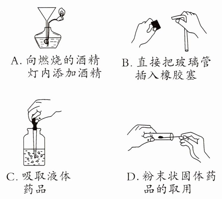 D [解析]给试管中的试剂加热时,先预热,后集中在药品下方加热,防止受热不均而使试管破裂,A正确;实验室制取气体时,先要检查装置气密性,防止产生的气体跑掉,B正确;连接乳胶管和玻璃导管,要先用水润湿,缓缓用力即可轻松插入,不要强行用力,防止玻璃导管折断,C正确;使用胶头滴管滴加液体时,滴管要在容器口上方竖直滴加,不能伸入容器中,更不能接触容器内壁,D错误。