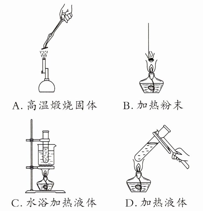 D [解析]可用坩埚钳夹持固体在酒精喷灯上进行高温煅烧,A正确;可用燃烧匙在酒精灯火焰上加热粉末,B正确;给试管中的液体加热时,可采用水浴加热液体的方法,C正确;给试管中的液体加热时,用酒精灯的外焰加热试管里的液体,且液体体积不能超过试管容积的$\frac{1}{3}$,图中液体超过试管容积的$\frac{1}{3}$,D错误。