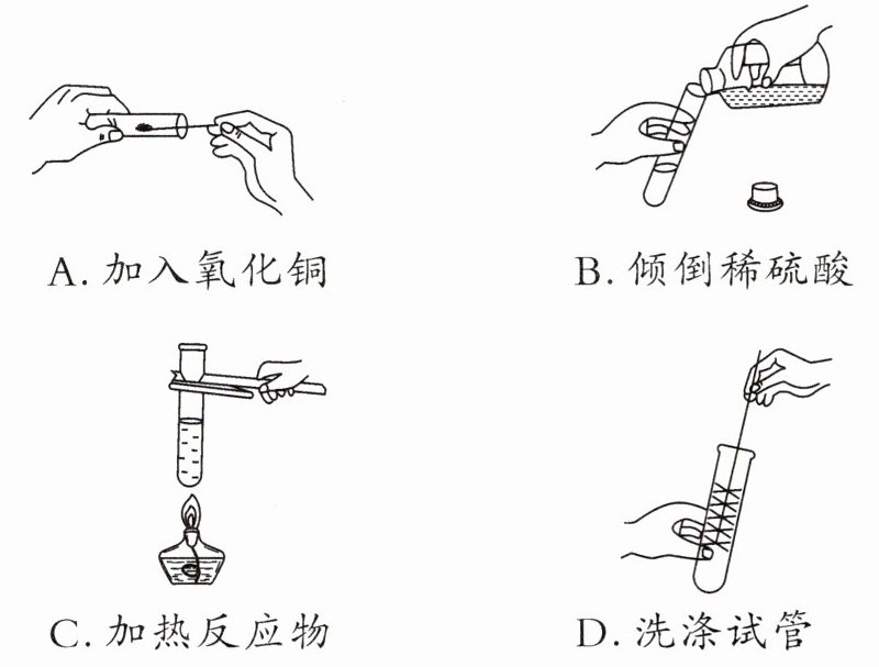 1. 某同学做氧化铜与稀硫酸反应的实验,操作示意图如下,其中操作有错误的是( )。