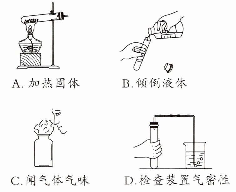 D [解析]给试管中的固体加热时,为防止冷凝水回流到热的试管底部,试管口应略向下倾斜,A错误;向试管中倾倒液体试剂时,瓶塞要倒放,标签要对准手心,瓶口紧挨,B错误;闻气体的气味时,应用手在瓶口轻轻地扇动,使极少量的气体飘进鼻子中,不能将鼻子凑到集气瓶口去闻气体的气味,C错误;检查装置气密性的方法:把导管的一端浸没在水里,双手紧贴容器外壁,若导管口有气泡冒出,则装置不漏气,D正确。