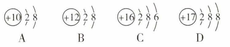 D [解析]质子数=核外电子数=10,为原子,A错误;质子数=12,核外电子数=10,质子数>核外电子数,为阳离子,B错误;质子数=16,核外电子数=16,质子数=核外电子数,为原子,C错误;质子数=17,核外电子数=18,质子数<核外电子数,为阴离子,D正确。