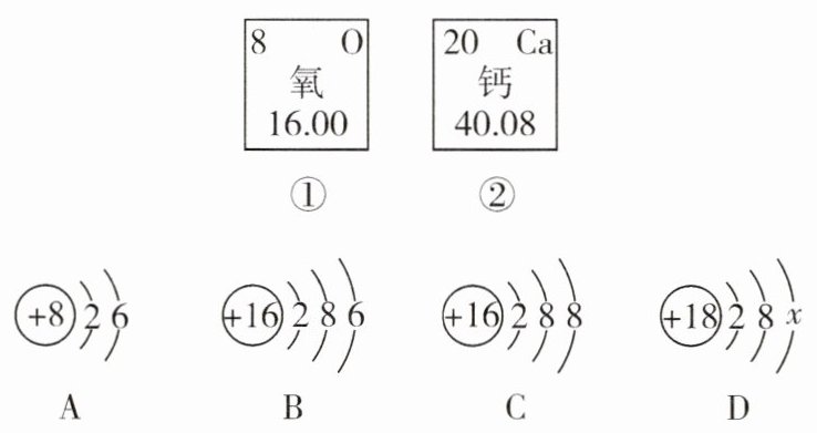 18 下图中的①、②是氧元素、钙元素在元素周期表中的信息,A、B、C、D是四种粒子的结构示意图。请你回答下列问题。