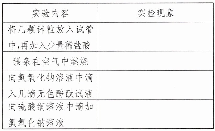 (1)有大量气泡产生,锌粒逐渐溶解 发出耀眼白光,放热,生成白色粉末状固体 无色溶液变成红色 产生蓝色絮状沉淀