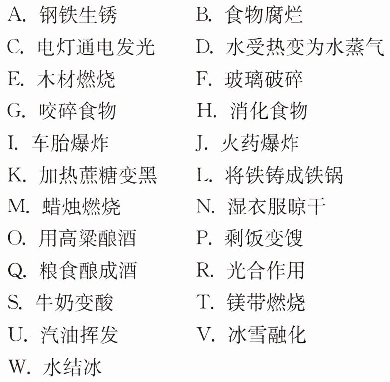 20 下列变化属于物理变化的有________________(填字母,下同);属于化学变化的有________________。