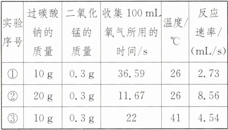 (2)Ⅰ.①②中二氧化锰的质量、温度均相同,过碳酸钠的质量不同,对比数据可以发现,当氧化锰用量、温度保持相同时,过碳酸钠用量越大,收集相同体积氧气所用时间越短,反应速率越快;Ⅱ.①③中过碳酸钠的质量、二氧化锰的质量相同,温度不同,对比实验①③的数据发现,当过碳酸钠质量相同、二氧化锰质量相同时,收集相同体积的氧气所用的时间越短,说明温度越高,反应速率越快。
