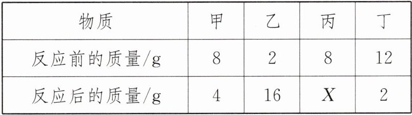 D [解析]由表中数据分析可知,甲反应前后的质量减少了8g−4g=4g,甲是反应物,参加反应的质量为4g;同理可以确定乙是生成物,生成的质量为16g-2g=14g;丁是反应物,参加反应的质量为12g−2g=10g;由质量守恒定律,丙的质量不变,可能作该反应的催化剂,也可能没有参加反应。反应后X的值为8,A正确;参加反应的甲、丁两种物质的质量比为4g:10g=2:5,B正确;该反应的反应物为甲和丁,生成物是乙,符合“多变一”的形式,属于化合反应,C 正确;丙的质量不变,可能作该反应的催化剂,也可能没有参加反应,D错误。