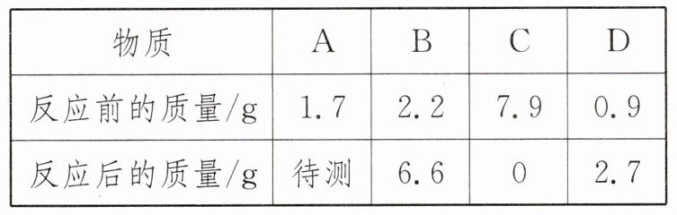 [解析]反应后B物质质量增加了4.4g,是生成物;反应后C物质质量减少了7.9g,是反应物;反应后D物质质量增加了1.8g,是生成物;根据质量守恒定律可知,A物质的待测数据为1.7g+2.2g+7.9g+0.9g −6.6g−2.7g=3.4g;反应后A物质质量增加了1.7g,所以是生成物,反应物是一种,生成物是三种,属于分解反应;该反应中B和D两种物质变化的质量比为4.4g:1.8g=22:9。