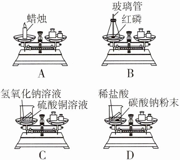 C [解析]蜡烛和氧气反应生成二氧化碳和水,二氧化碳和水都跑到空气中去了,反应前后天平不平衡,A错误;玻璃管与外界相通,红磷燃烧消耗氧气,外界的氧气会进入锥形瓶,反应前后天平不平衡,B错误;此装置中生成氢氧化铜沉淀和硫酸钠,没有物质跑出来,反应前后容器中物质的总质量也不变,能直接验证质量守恒定律,C正确;稀盐酸和碳酸钠反应生成的二氧化碳气体逸出,反应后烧杯中物质的质量减少,不能直接验证,D错误。