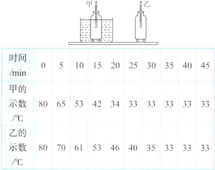 小明注意到妈妈是把饭菜放在空气中冷却的,而厨房中适合用来冷却的另一种物质就是水。水和空气哪个的导热性能好呢?为此小明用两个相同的牛奶瓶,都装入热牛奶,一个放在温度与室温相同的水中,另一个就放在空气中,为了尽量减少其他因素的影响,他把两个瓶都用木块垫起来,放在同一个桌面上,如图所示。实验时他每隔一定的时间记录一次甲、乙两温度计的示数,得到的数据如表: