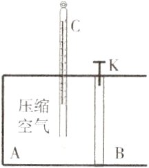 16. 如图所示,B是被销钉K锁住的活塞,汽缸A密封有压缩空气,C是一支温度计,若活塞与汽缸壁之间没有摩擦,当把销钉K拔出后,我们会观察到活塞和温度计发生什么现象?试说明原因。