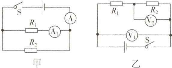 11.如下图甲所示的电路中,电源电压保持不变,当开关S闭合后,两电流表的指针偏转至同一位置,则通过R₁和R₂的电流之比I₁:I₂=________。若将电阻R₁和R₂连接在如图乙所示的电路中,通过它们的电流之比I₁':I₂'=________,两电压表V₁与V₂的示数之比为________。