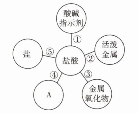 13. 归纳是学习的重要方法,小红在复习盐酸的性质时归纳出盐酸的五条化学性质(如图所示,连线表示相互反应)。