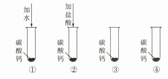 15. 碳酸钙是一种白色固体,可溶于稀盐酸并产生无色气体。某同学想知道稀盐酸中的哪种粒子(H₂O、H⁺、Cl⁻)能使碳酸钙溶解并产生无色气体,请你和同学们一起通过如图所示的四个实验完成这次探究活动。
