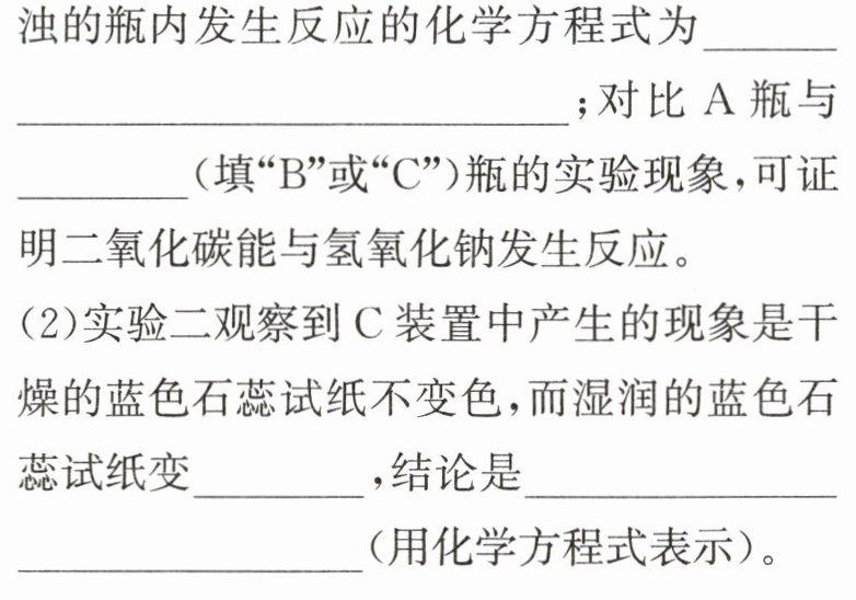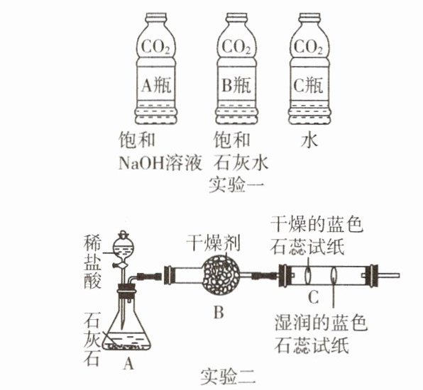 (1)实验一中振荡三个矿泉水塑料瓶,观察到塑料瓶变瘪的程度为$A > B > C$,其中变浑