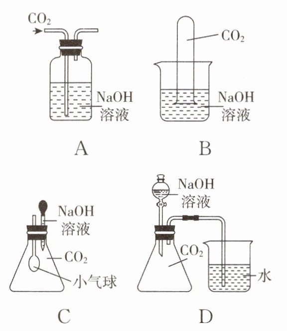 8. 下列验证“$CO_{2}$与$NaOH$溶液反应”的装置中,不能观察到明显现象的是(装置气密性均良好)( )