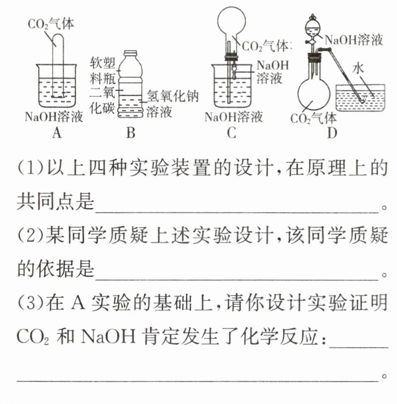 12. (市北区期末)为探究$CO_{2}$和$NaOH$确实发生了化学反应,某实验小组的同学设计出了下列4种实验装置,请回答下列问题。