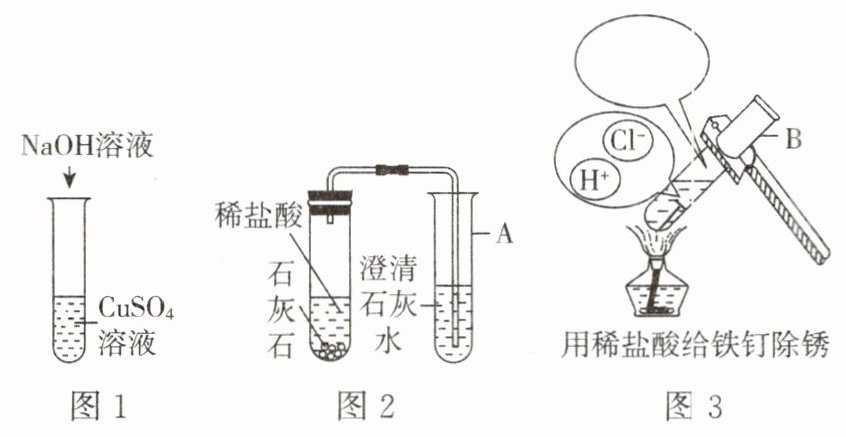 (3)图3试管中B中铁钉变得光亮且表面有气泡生成,溶液呈黄色,除$\mathrm{H^+}$和$\mathrm{Cl^-}$外,此时溶液中和液面上方存在的微观粒子还有______(填粒子符号,不考虑空气),写出反应的化学方程式:______(任意一个即可)。