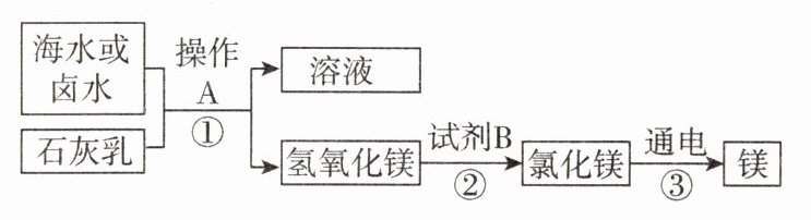海水或卤水$\xrightarrow{(\ \ \ \ \ \ )}$氢氧化镁$\xrightarrow{稀盐酸}$________$\xrightarrow{通电}$镁