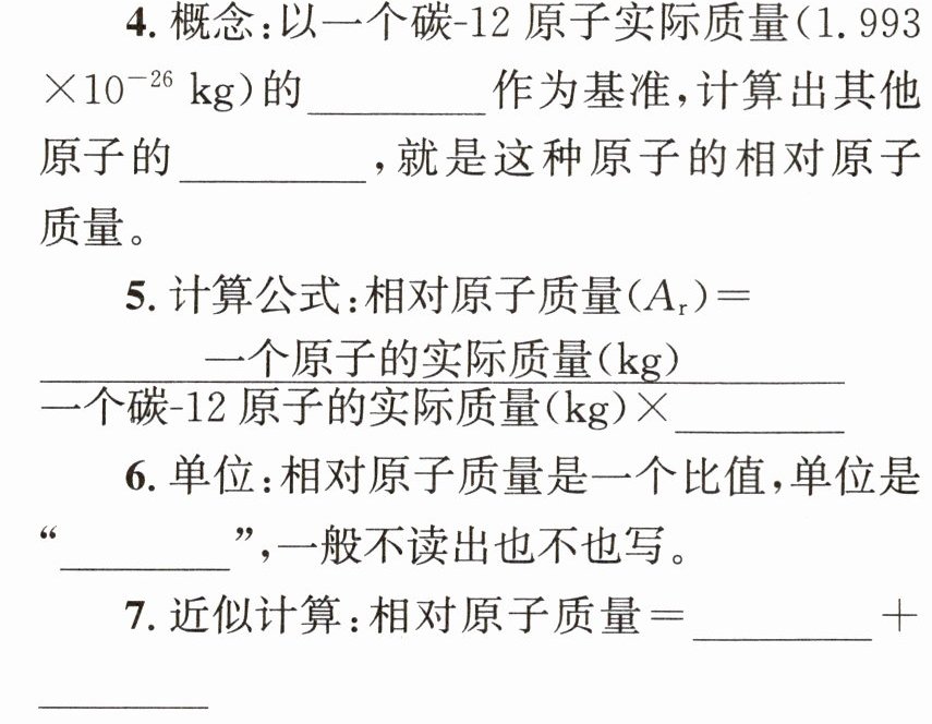 4. $\frac{1}{12}$ 相对质量 5. $\frac{1}{12}$ 6. 1 7. 质子数 中子数