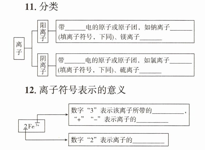 10. 原子 11. 正 $Na^{+}$ $Mg^{2+}$ 负 $Cl^{-}$ $S^{2-}$ 12. 电荷数 电性 个数