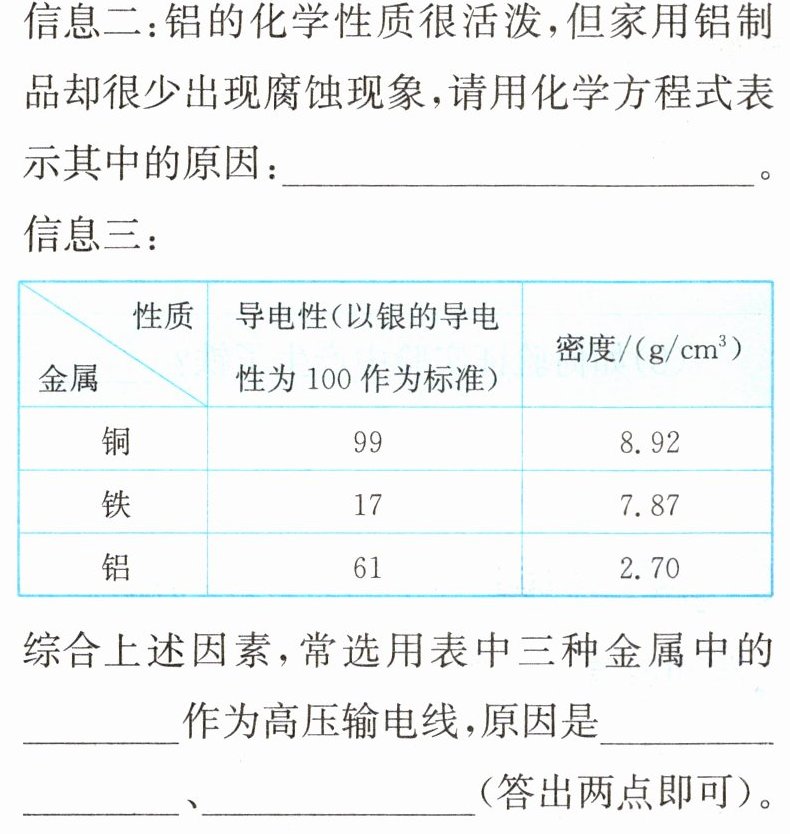 (2)Al $4Al + 3O_{2}\xlongequal{\;\;}2Al_{2}O_{3}$ 铝 铝的导电性较好 密度小(合理即可)