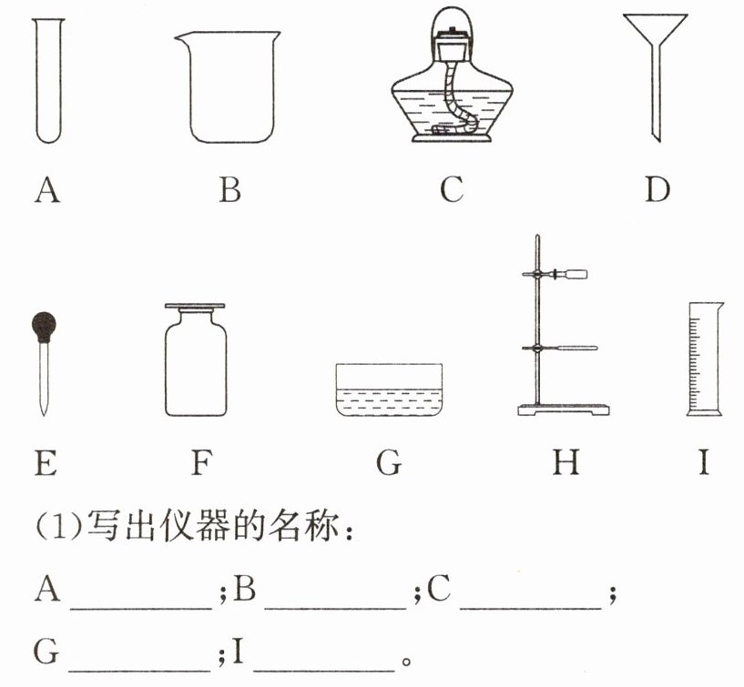 (2)用于滴加少量液体的是______(填字母序号,下同),可以直接在酒精灯火焰上加热的玻璃仪器是______,需垫陶土网才能加热的仪器是______,用于盛放气体的是______,用于量取一定量液体体积的仪器是______。