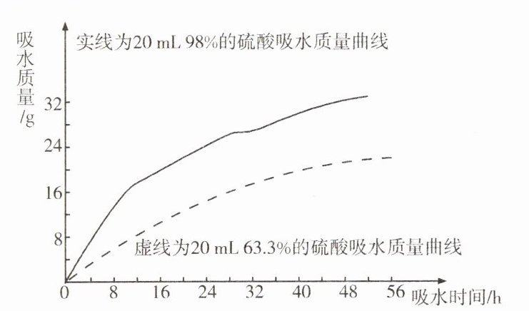 (2)探究浓硫酸的吸水性。兴趣小组把98%的硫酸20 mL和63.3%的硫酸(用10 mL 98%的硫酸与10 mL水配成)约20 mL分别放入两个相同的大表面皿中,称量、观察、记录、分析。根据室温环境下实验的数据绘成的曲线如图: