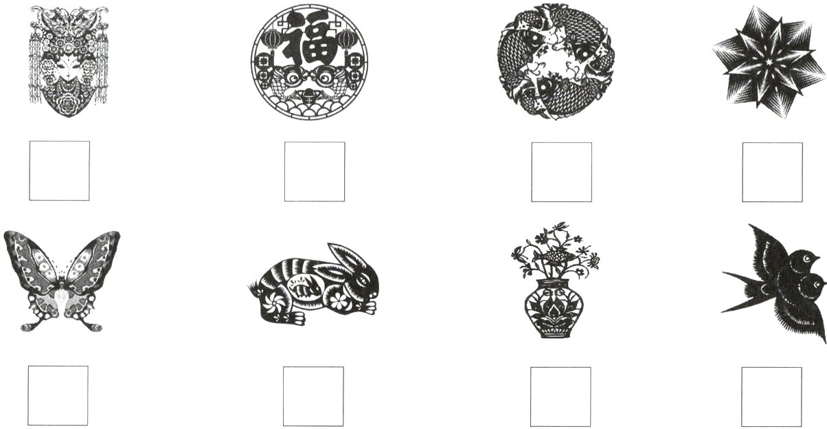 3.下面的剪纸,是轴对称图形的画“√”,不是轴对称图形的画“×”。(8分)