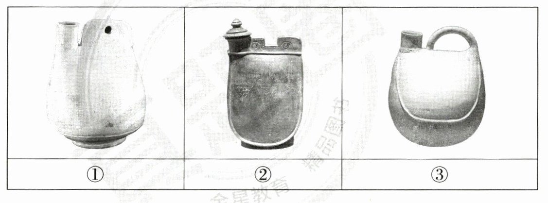 (2)排序:②①③。变化:鸡冠壶由无把的孔式改成提梁。原因:契丹人早期过着游牧生活,鸡冠壶全面模仿皮囊的形状,后来契丹人学会农耕生活,生活比较安定,有提梁的鸡冠壶便于提拎。