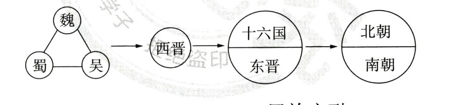 12.A【解析】图片显示从三国鼎立到西晋短暂统一,从东晋十六国再到南北朝时期,这体现了三国两晋南北朝时期的阶段特征是政权分立,故选A。