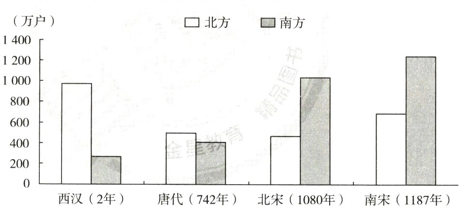 19.C【解析】题干“西汉至南宋北方和南方人口户数的变化”反映出南方人口逐渐超过北方,说明经济重心南移。故选C。