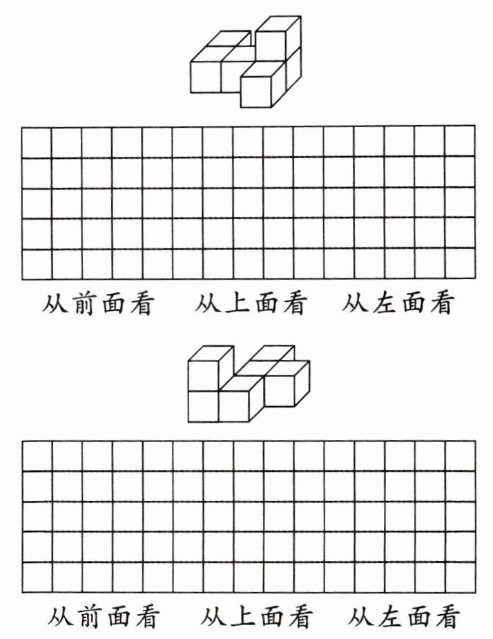 三 在方格纸上分别画出从前面、上面和左面看到的图形。