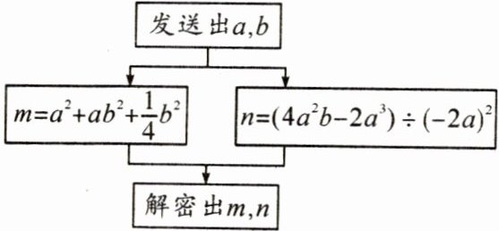 17.(8分)核心素养 应用意识 信息时代确保信息的安全很重要,于是在传输信息的时候需要加密传输:发送方将明文加密为密文传输给接收方,接收方收到密文后解密还原为明文.已知某种加密规则如图所示,当发送方发出$a = 2$,$b = 4$时,解密后明文的值:$m = \underline{\;\;\;\;\;\;}$,$n = \underline{\;\;\;\;\;\;}$.
