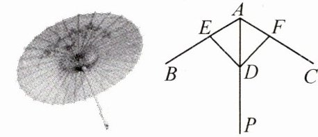12.(12分)新情境 传统文化 油纸伞是我国传统工艺品之一,它的制作工艺十分巧妙.如图所示的是一把油纸伞的实物图及其侧面示意图,伞骨AB = AC,伞圈D沿着伞柄AP滑动时,支撑杆DE = DF,AE = $\frac{2}{5}$AB,AF = $\frac{2}{5}$AC,从而使得伞柄AP始终平分同一平面内两条伞骨所成的∠BAC,请你说明其中的理由。