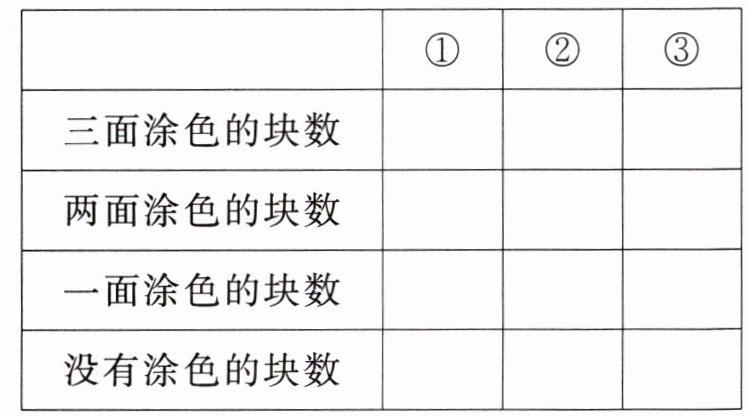 一 用棱长 1cm 的小正方体拼成如下的大正方体后,把它们的表面分别涂上颜色。在①、②、③中,三面、两面、一面涂色以及没有涂色的小正方体各有多少块?