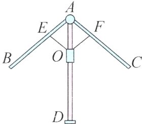 9 - 1 ★★空如图是雨伞开闭过程中某时刻的截面图,伞骨AB = AC,支撑杆OE = OF,AE = $\frac{1}{3}$AB,AF = $\frac{1}{3}$AC。当点O沿AD滑动时,雨伞开闭。在雨伞开闭过程中,∠BAD与∠CAD有何数量关系?请说明理由。