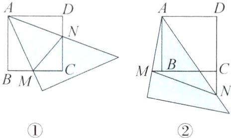 (1)如图①,延长MB至点H,使BH=DN,连接AH。因为四边形ABCD为正方形,所以∠D=∠ABC=∠BAD=90°,AD=AB。所以∠ABH=∠D=90°。在△ABH和△ADN中,因为AB=AD,∠ABH=∠D,BH=DN,所以△ABH≌△ADN(SAS),所以AH=AN,∠BAH=∠DAN。因为∠MAN=45°,所以∠DAN+∠BAM=∠BAD−∠MAN=45°,所以∠BAH+∠BAM=45°,所以∠MAH=45°=∠MAN。在△AMH和△AMN中,因为AH=AN,∠MAH=∠MAN,AM=AM,所以△AMH≌△AMN(SAS),所以MH=MN。又因为MH=BM+BH,所以MN=BM+DN。