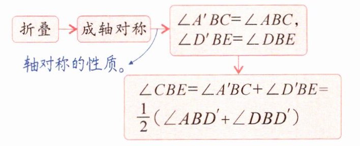 例10 ★[转化思想]如图,将长方形纸片的一角折叠,使顶点A落在点A'处,折痕为BC;再将长方形纸片的另一角也折叠,使顶点D落在点D'处,点D'在BA'的延长线上,折痕为BE。